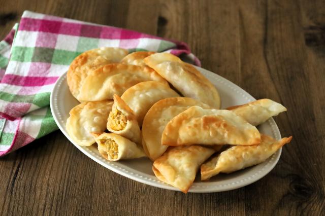 ③ 餃子の皮に②を12等分して中央にのせ、ふちに水をつけて半分に折りたたみ、しっかりとくっつける。