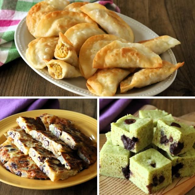 (写真上段)ひよこ豆のサモサ風、(写真下段・左から)レッドキドニーと玉ねぎのチーズチヂミ、抹茶あずき蒸しパン