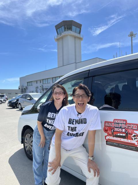 写真は主人公の安部礼司と妻の優。前回開催した「安部礼司のふれあいドライブ旅2025夏~ありがとうを伝え隊~ 山口、徳島、岡山」での1枚。