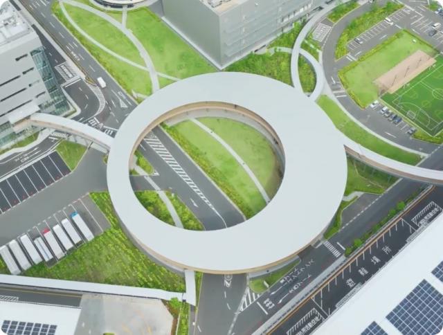 「相模原1」の5階部分、マンションに例えれば10階から12階に相当する高さの屋上には敷地全体が見渡せる展望スペースが設けられています。4棟の物流施設に囲まれた敷地中央には、フットサルコートや、この施設を象徴する円形の建物「リング棟」が広がっています。