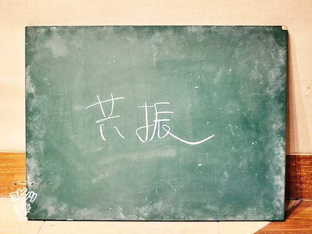 今回は、数式じゃなくて物理用語を書きました。『共振』という言葉です! これは、振動数、周波数が合うと大きく揺れ出すっていう現象です。