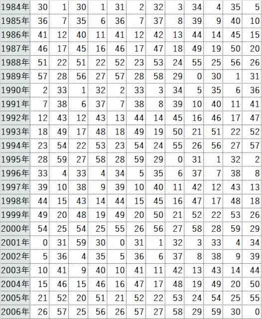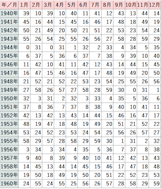 1. 下の表から「自分の生まれた年」と「自分が生まれた月」が交差する数字を出します。