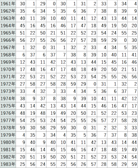 その合計数字が「60以下」ならそのまま、「61以上」なら60を引いた数字を出します。それが干支番号です。