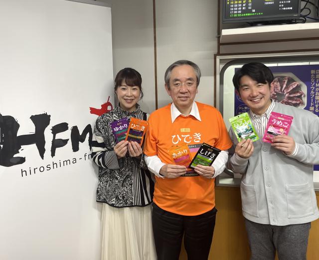 (左から)アシスタントの俊山真美(広島FM)、三島食品株式会社 代表取締役社長 末貞操さん、パーソナリティの小堺翔太